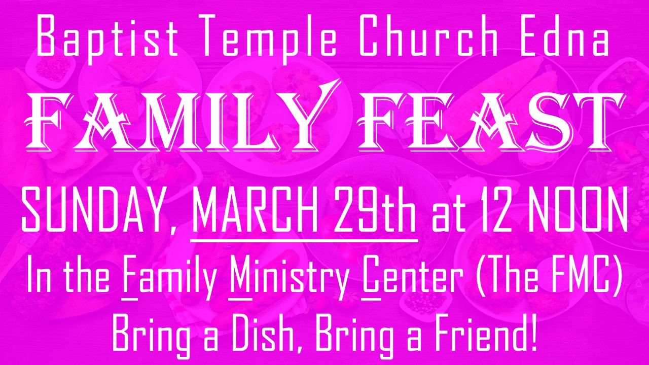 Easter is on April 5th this year, and we know that many of you have family meals and gatherings after church that day, so we did not want to schedule our Family Feast. March has 5 Sundays, so we are moving our Family Feast to March 29th, on Palm Sunday. Make sure you adjust your calendars, invite someone you are praying for, and bring your favorite foods.
